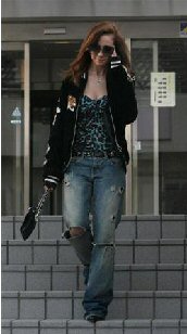 豊満なバストや腰のくびれを強調したキャミソールに、龍虎柄のスカジャン姿で実家マンションを出る沢尻エリカ=東京・世田谷区(写真:サンケイスポーツ)